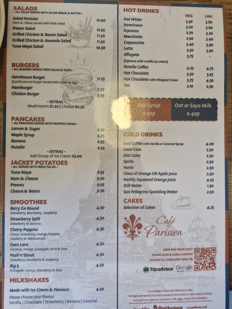 Moreover, you’ll find value for your money here, a feature echoed by many diners. The inclusion of freshly prepared salads complements the meals beautifully. Whether you’re stopping by after a stroll in the New Forest or just seeking a cozy spot, Café Parisien is a must-visit destination for food lovers.